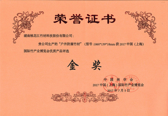 湖南桃花江竹材科技股份有限公司生產(chǎn)的戶外防腐竹地板在2017年7月中國(上海)國際竹產(chǎn)業(yè)博覽會中榮獲金獎,該獎項由中國林學會、中國(上海)國際竹產(chǎn)業(yè)博覽會頒發(fā)。湖南桃花江竹材科技作為中國竹材領(lǐng)域高炭防腐技術(shù)的發(fā)明人,在中國竹材領(lǐng)域有著舉足輕重的地位。湖南桃花江竹材科技一直專注與于竹材的戶外運用研發(fā)與創(chuàng)新,為全球客戶提供高品質(zhì)竹材。